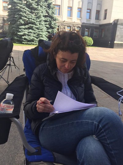 Віце-спікер парламенту Оксана Сироїд під час акції голодування біля Адміністрації президента пише статтю. Про це повідомляють у Facebook.