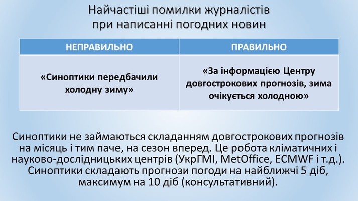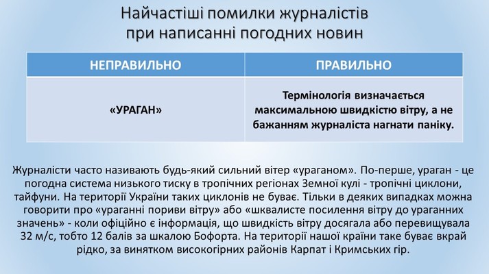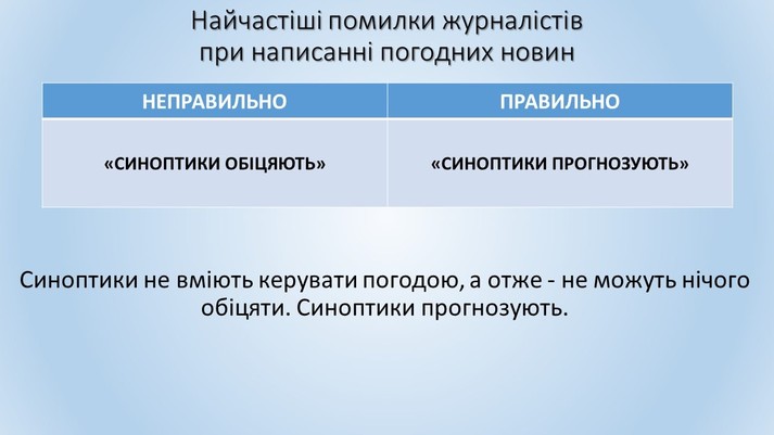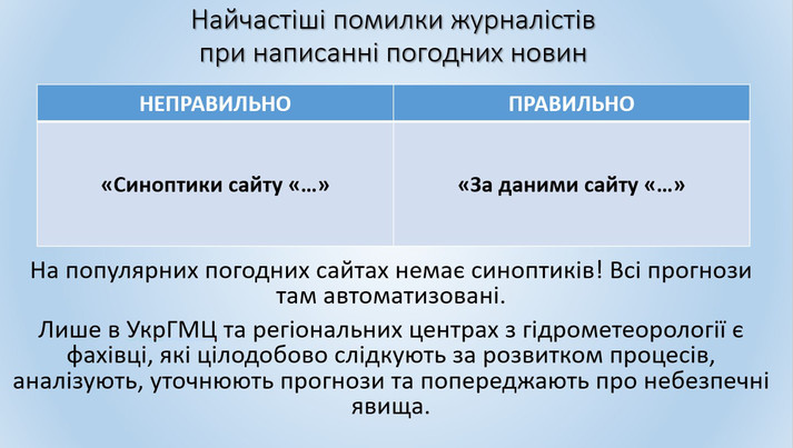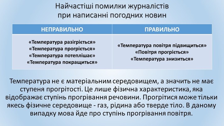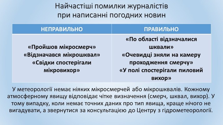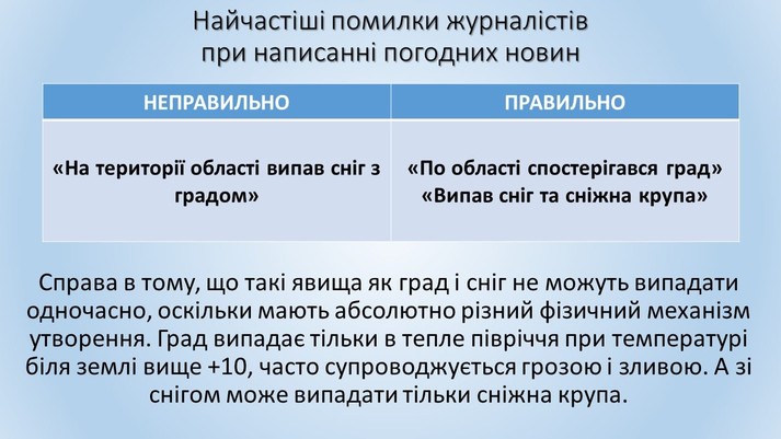 Аби ЗМІ краще розбиралися у написанні новин про погоду, Укргідрометцентр оприлюднив кілька яскравих прикладів з помилками та правильними варіантами опису метеорологічної ситуації.