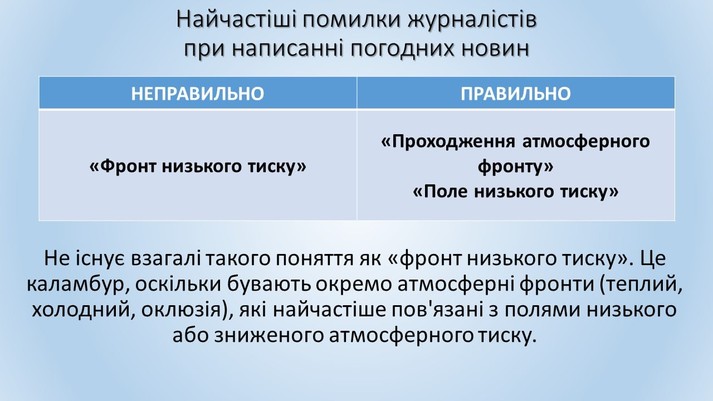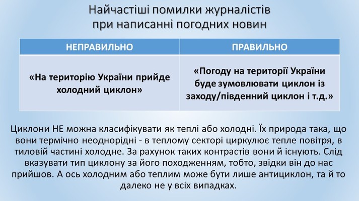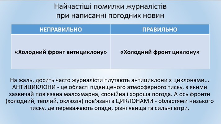 Наприклад, синоптики звертають увагу, що журналісти часто плутають циклон з антициклоном. З антициклонами пов’язана спокійна, малохмарна погода. А ось фронти (холодний, теплий, оклюзія) мають вже відношення до циклонів, де переважають опади і сильні вітри.