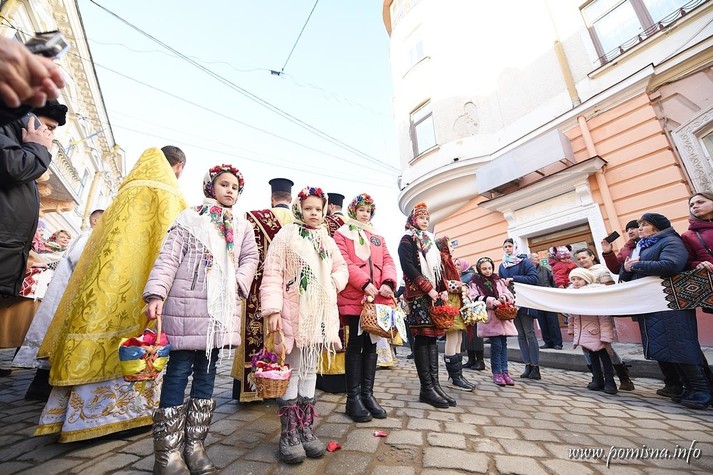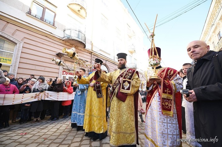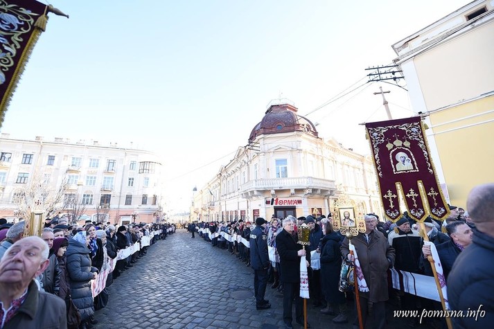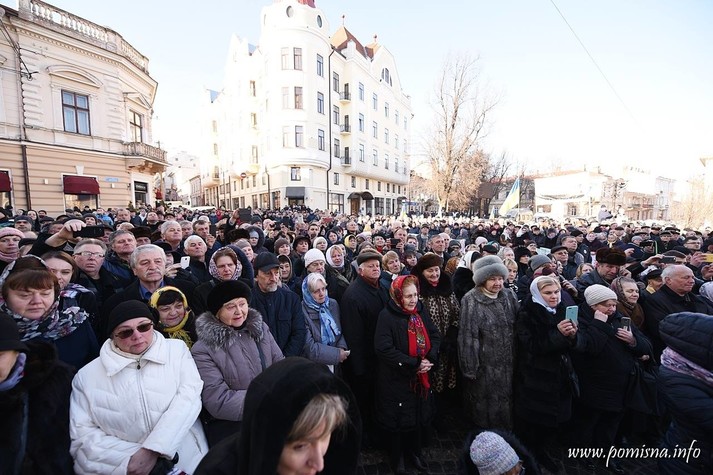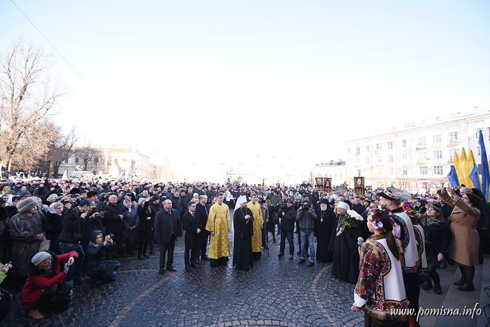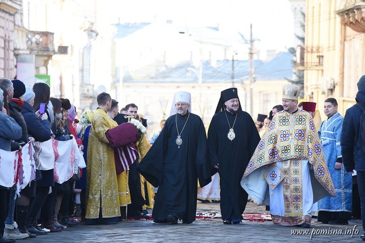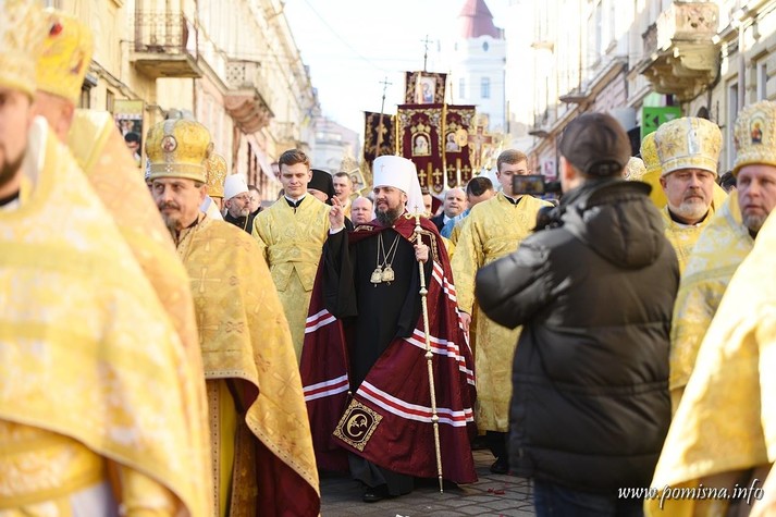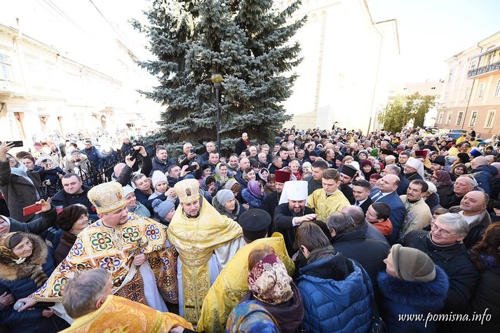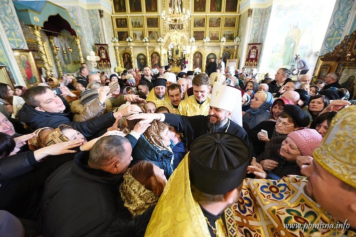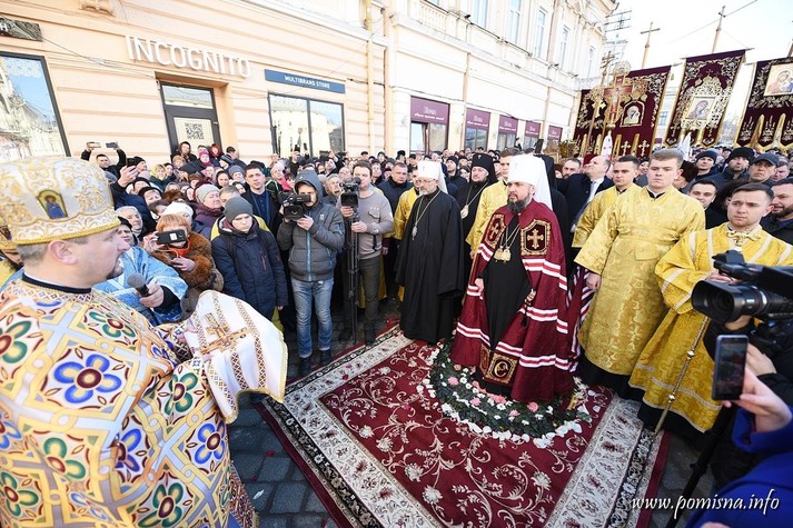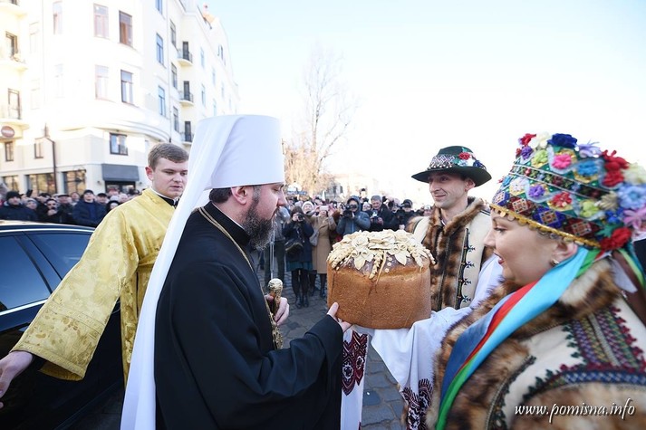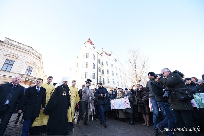 Віряни з усієї області зустріли Блаженнішого Епіфанія на площі Філармонії. Уздовж умовного коридору до храму, де проходив Глава ПЦУ, люди тримали вишиті рушники.