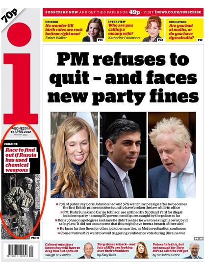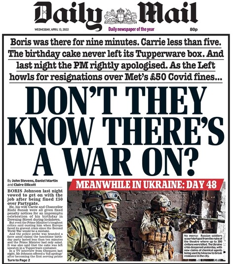 Daily Mail критикує тих, хто закликає до відставки прем'єр-міністра, питаючи: «Хіба вони не знають, що йде війна?». Газета повідомляє, що містер Джонсон був присутній на святкуванні дня народження протягом дев'яти хвилин і що його святковий торт ніколи не залишав коробку Tupperware. На сторінці також є фотографія російських солдатів в українському місті Маріпуоль, на якій йдеться, що до мирних жителів там ставляться «без пощади».
