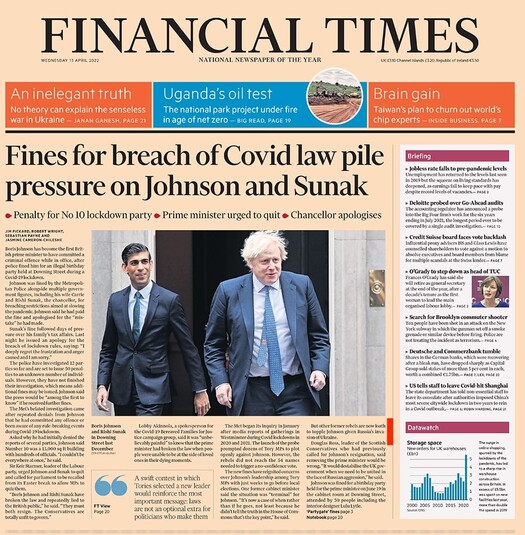 The Financial Times. У редакційній статті визнає, що нині «далеко від ідеального» часу для змін у Великій Британії, але уряд не може зберегти свою легітимність, якщо він не дотримується законів, які він наклав на своїх громадян. Швидкий конкурс на нового лідера Торі дозволить уряду перегрупуватися та зосередитись на Україні.