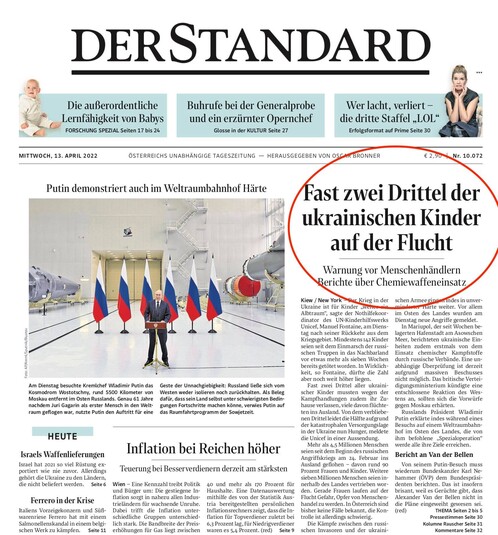 Австрійська газета Der Standard. Війна в Україні «продовжує бути кошмаром»для дітей, заявив у вівторок координатор екстреної допомоги дитячого фонду ООН Unicef Мануель Фонтейн після повернення із зони бойових дій. Щонайменше 142 дитини було вбито з того часу, як російські війська вторглися до сусідньої країни трохи більше семи тижнів тому. Насправді, за словами Фонтейна, число, ймовірно, є набагато вищим.