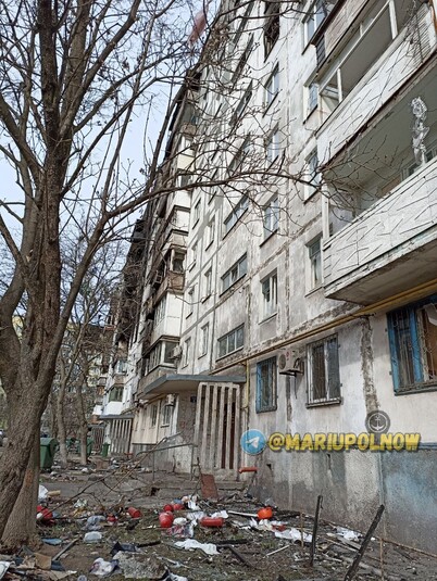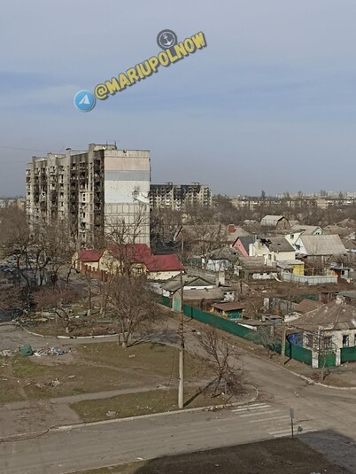 На фото можна побачити обстріляні та зруйновані будинки у лівобережній частині Маріуполя.