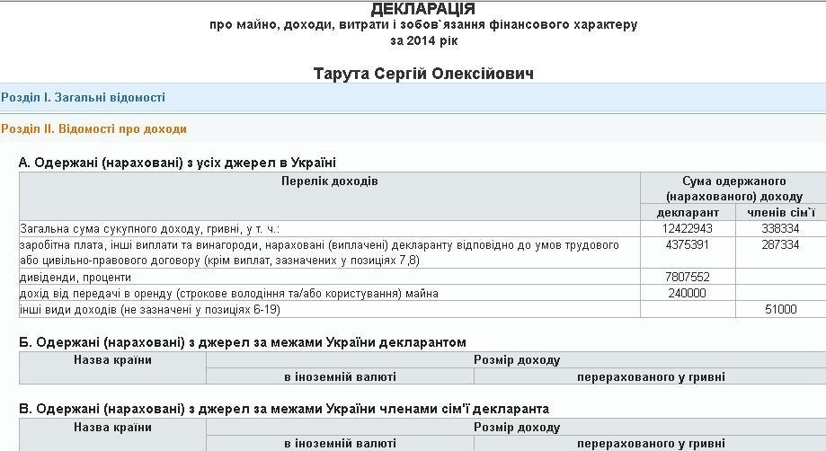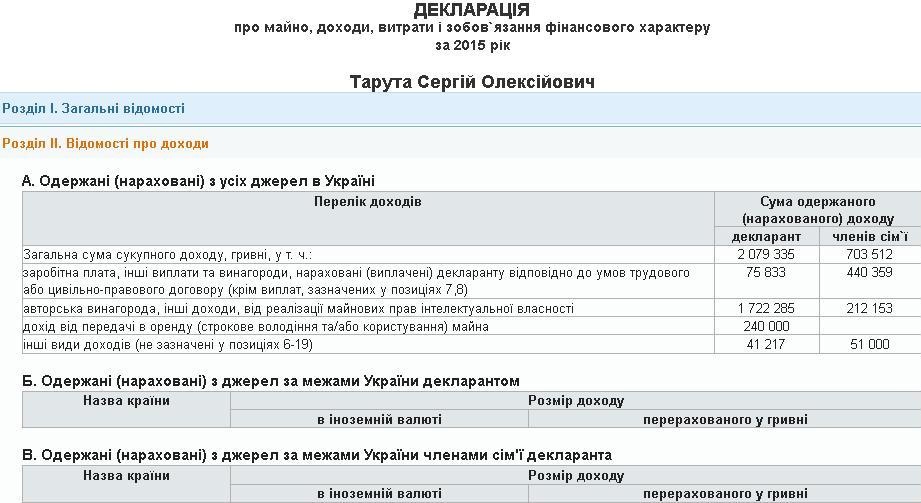 На сайті Верховної Ради опублікована декларація позафракційного депутата Сергія Тарути за 2015 рік