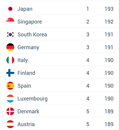 Очолює рейтинг Японія, її громадяни можуть відвідати 193 країни. На другом місці - Сінгапур з безвізовим доступом в 192 країни. Третє місце ділять Південна Корея та Німеччина, чиї громадяни можуть відвідати з безвізовим доступом 191 країну.