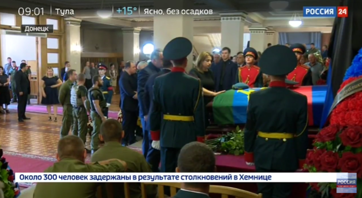 Перед похороном пройшла церемонія прощання з ватажком. Її відвідали, зокрема, «міністр доходів ДНР» Олександр Тимофєєв, який отримав важкі поранення після вибуху в ресторані «Сепар».