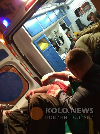 Журналіст із місця події повідомляє, що поранений учасник АТО, активіст Олександр Коба. За словами Анатолія Ханка, заступника голови Полтавської облради, у Коби ножові поранення.