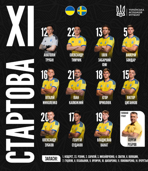 Керманич національної команди України Сергій Ребров обрав одинадцятку футболістів на півфінал плейоф кваліфікації до Чемпіонату світу 2026 року проти збірної Швеції. Про це повідомляє «Главком» із посиланням на офіційний сайт УАФ.