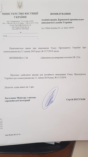 Він також оприлюднив наказ, де зазначено, що Литвінова помилував президент України Володимир Зеленський.