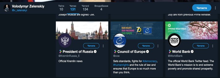 Зараз в профілі зібрані репости з реакцією світових лідерів, зовнішньополітичних відомств і ЗМІ на перемогу Зеленського.