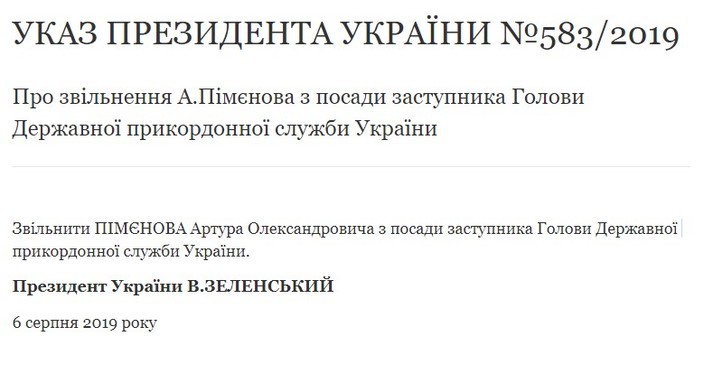Указом №583/2019 глава держави звільнив з посади заступника голови Держприкордонслужби Артура Піменова.