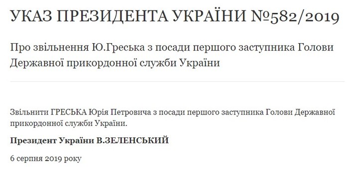 «Звільнити Гресько Юрія Петровича з посади першого заступника голови Державної прикордонної служби України», - йдеться в указі №582/2019.