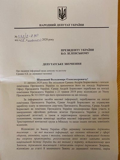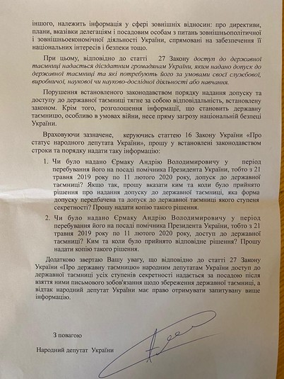 Також нардеп хоче з’ясувати, за чий рахунок новий глава Офісу Зеленського брав участь в офіційних делегаціях