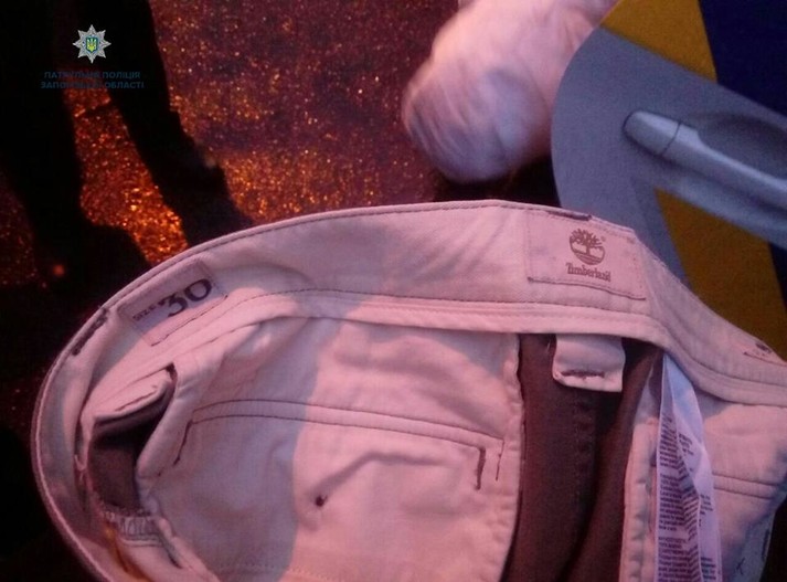 Як повідомляє прес-служба патрульної поліції Запоріжжя, помітивши інспекторів, чоловік намагався сховатися, але його затримали. Під час поверхневої перевірки на ньому також виявили кофту і штани відомого бренду з магазинними бирками.