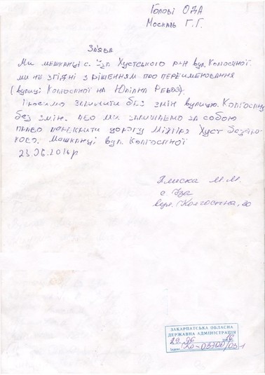Ми мешканці с.Іза Хустського р-н вул. Колгоспної. Ми не згідні з рішенням про переименовання (вул. Колгоспної на Юліана Ревая). Просимо залишити без змін вулицю Колгоспну без змін. Або ми залишаємо за собою право перекрити дорогу Міжгір’я Хуст безстроково. Мешканці вул. Колгоспної.