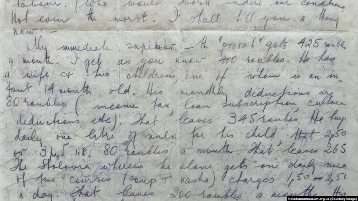 Також він зазначав: «З кожним місяцем стає все гірше і гірше, тому цього місяця я отримую картки на 4 робітників, тобто, наприклад, одну картку треба розділити між 4 працівниками та їхніми сім'ями, тобто кожен отримує «нічого»!! Тут ми всі працюємо тільки за хліб. Нічого іншого ми не отримуємо, крім кількох рублів».