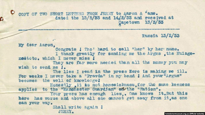 «Розпочавши форсовану індустріалізацію в 1928 році, СРСР закуповував техніку за кордоном та активно запрошував іноземних спеціалістів, які вміли працювати з нею. Так у 1930-му з ПАР до УСРР потрапив Джері Берман – інженер містобудування та залізничного сполучення. У 1932-1933 роках він побував у Москві, Луганську та Харкові, але більшість часу провів у Станиці Луганській. Навколишню дійсність він описував у листах до братів, сестри та друга у ПАР, США та Великій Британії», – ідеться у повідомленні.
