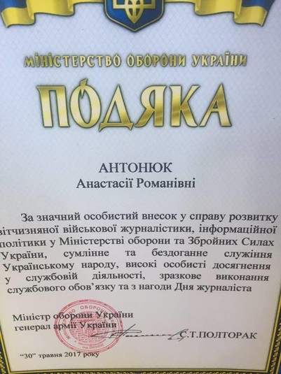 Журналістка, яку звинувачували ледь не в замаху на вбивство військових, отримала подяку від Міноборони