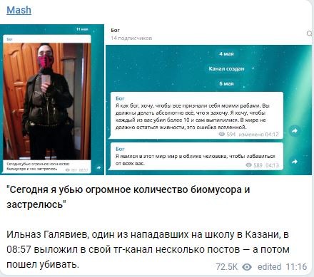 «Це Ільназ Галявієв, йому 19 років і це він – один з двох казанських стрільців... При затриманні Ільназ заявив, що за адресою його прописки закладена бомба», – йдеться в повідомленні.