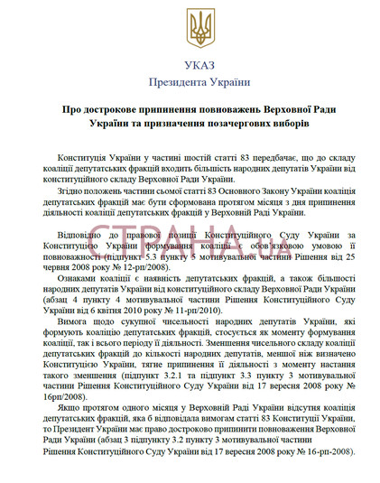 «Якщо протягом одного місяця у Верховній Раді України відсутня коаліція депутатських фракцій, яка б відповідала вимогам статті 83 Конституції України, то президент України має право достроково припинити повноваження Верховної Ради України», - йдеться в проекті указу.