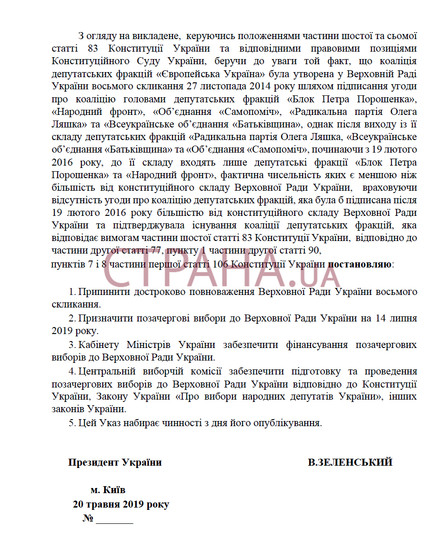 - Призначити позачергові вибори до Верховної Ради України на 14 липня 2019 року.