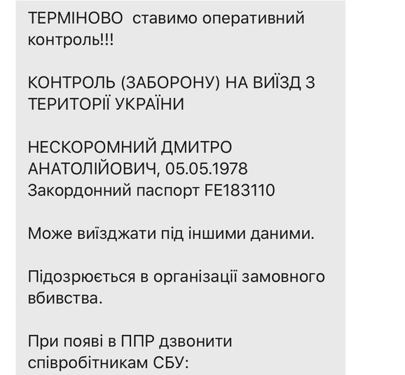 «Нескоромний оголошений у розшук, йому заборонено виїзд із України», – повідомив Бутусов.