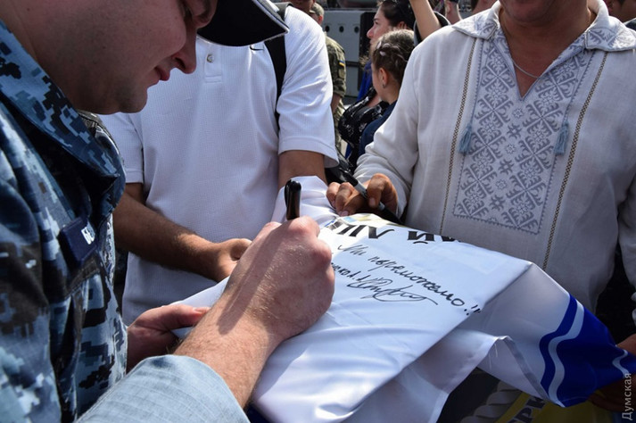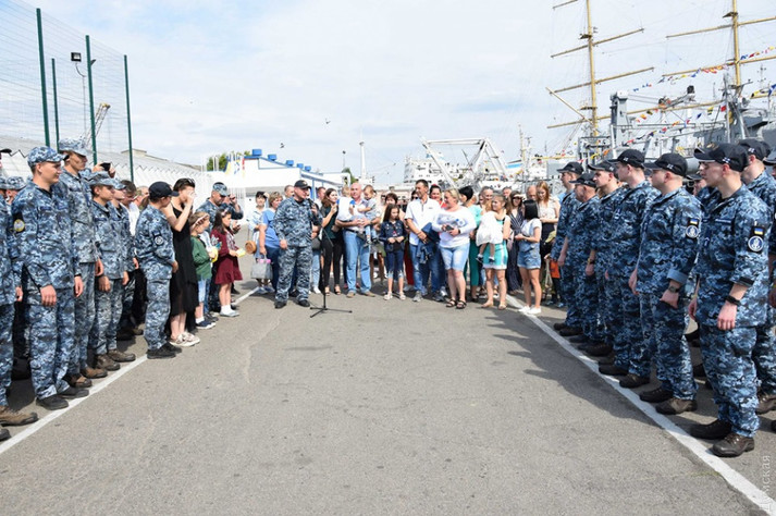 «Пасажири пересіли на автобуси, які попрямували на військово-морську базу «Південь» (колишня «Західна») в Практичній гавані Одеського порту. Там відбудеться урочисте шикування», - йдеться в повідомленні.