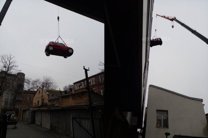 У центрі Одеси на балкон багатоповерхівки за допомогою підйомного крана підняли автомобіль. Фото та відео від очевидців опублікували Telegram-канали «Курс Одессы» та «Х***ая Одесса».