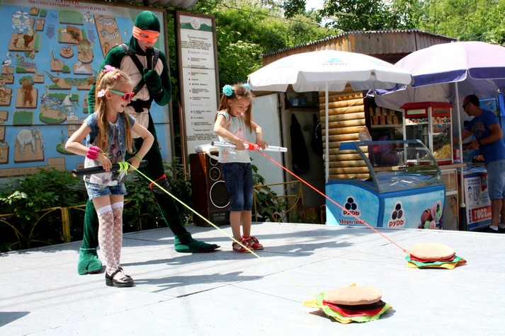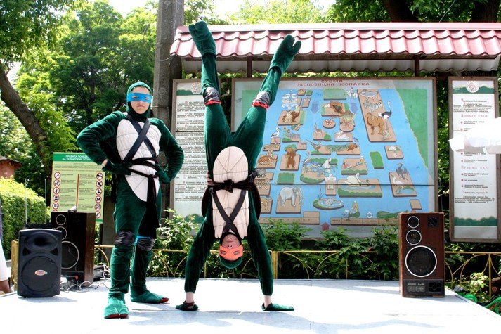 Гостей зоопарку зустрічали веселі аніматори, Черепашки Ніндзя. Улюблені персонажі підготували для дітей цікаві ігри, конкурси та естафети.