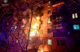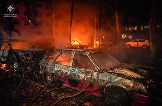 У результаті удару сталось загорання газової труби, чотирьох припаркованих легкових автомобілів, балконів на третьому та четвертому поверхах та квартири на другому поверсі п’ятиповерхового житлового будинку на загальній площі 50 кв. м. Про це повідомляє ДСНС України.