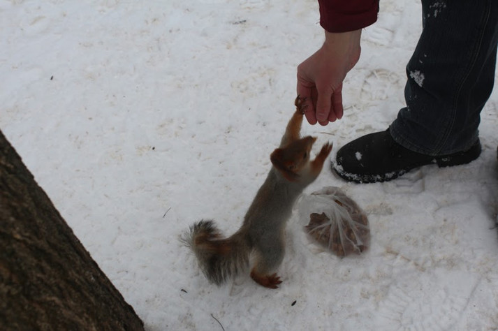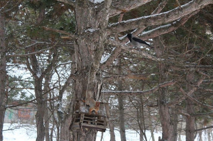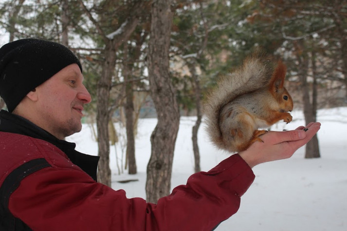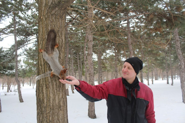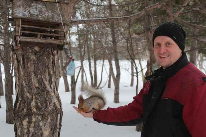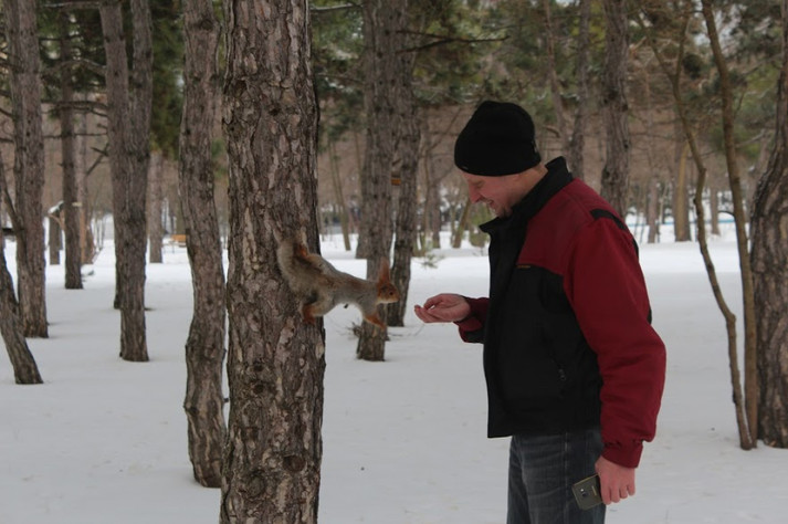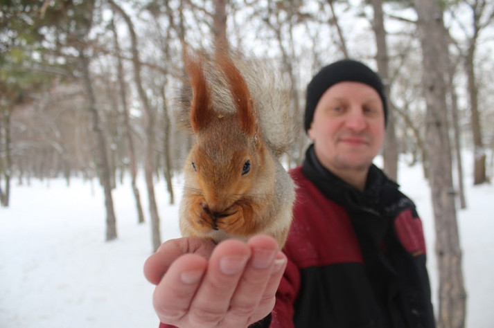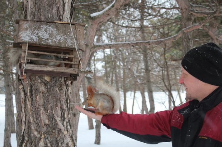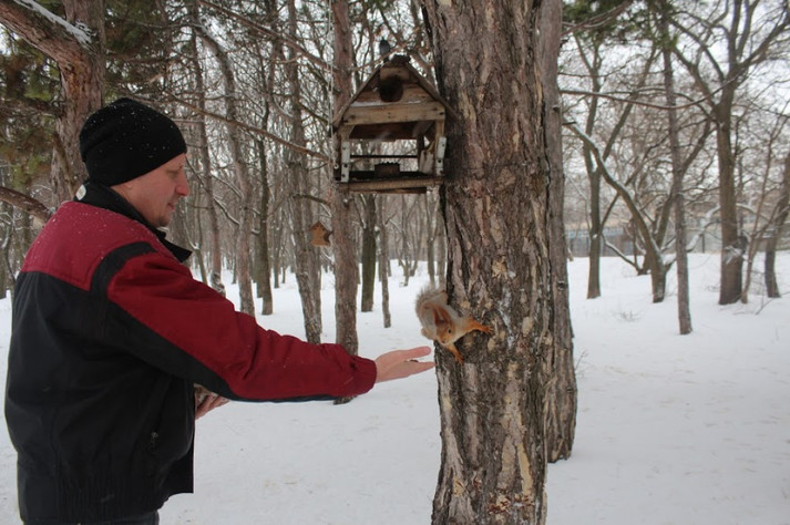 Домовившись заздалегідь про зустріч з Святославом Челбашевим навідалися у парк - у білок є свій розпорядок дня, і треба поважати їх свободу! Святослав разом з дружиною Тетяною багато років тому взяли шефство над пухнастими красунями і практично щодня приходять їх відвідати. Цим же, за їхніми словами, займаються і інші люди, які регулярно поповнюють годівниці для птахів і білок.