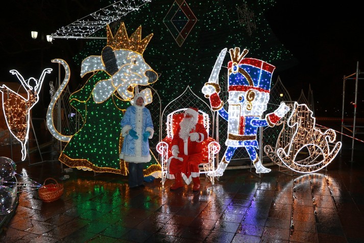 На Думской площади у главной елки гостей встречают персонажи новогодней сказки «Щелкунчик». Одесситы и гости города могут увидеть Мышиного короля, его трон, балерину и, конечно, самого Щелкунчика.