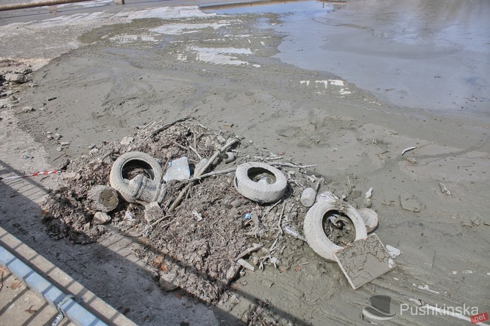 Зараз на території ставка працюють комунальники і спецтехніка. Трактор збирає мул і сміття в одне місце, а двоє робітників сортують знайдене. На дні водойми лежать пляшки, автомобільні шини та інше сміття.