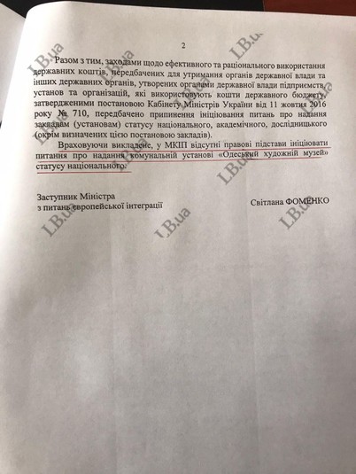 У Міністерства культури відсутні правові підстави ініціювати питання щодо надання Одеському художньому музею статусу національного. Такою є офіційна відповідь міністерства на відповідне звернення голови ОДА Сергія Гриневецького, викладена у листі за підписом заступниці міністра Світлани Фоменко.