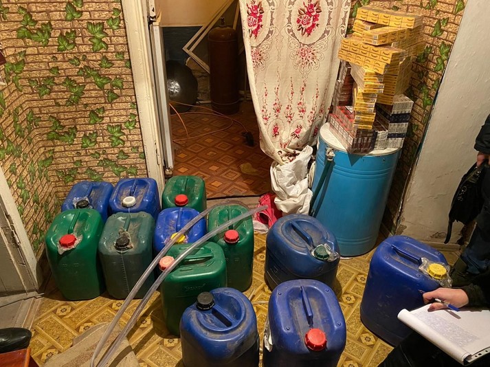 Під час обшуків виявлено майже 1500 літрів спиртової суміші і близько 3 тис. пачок сигарет