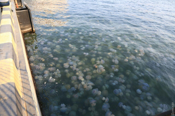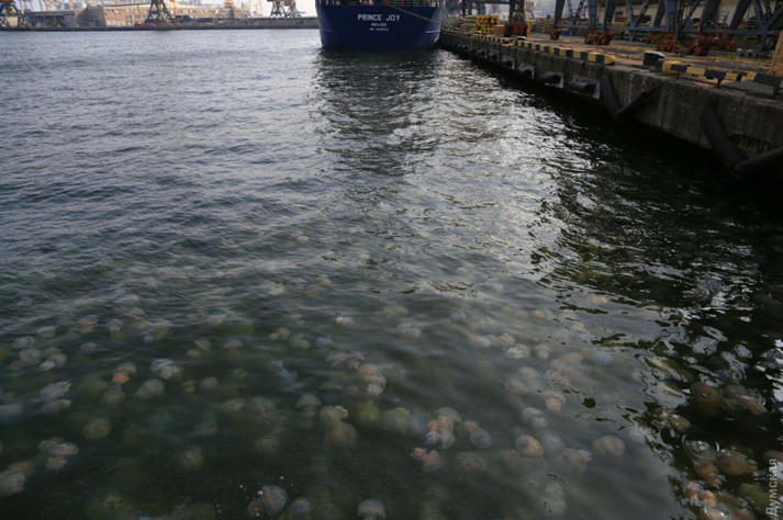 Величезна кількість медуз спостерігається у неділю, 21 жовтня, на одеському узбережжі. Особливо багато їх в акваторії Одеського порту в районі 15 і 16 причалів. Про це пише «Думська».