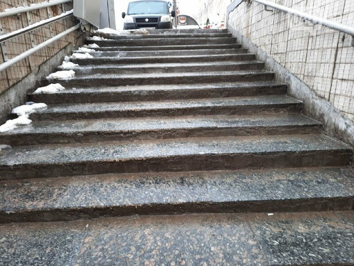 Пісок, який комунальні працівники розкидали маленькими купками, давно втоптали в лід – він більше не рятує від ковзання.