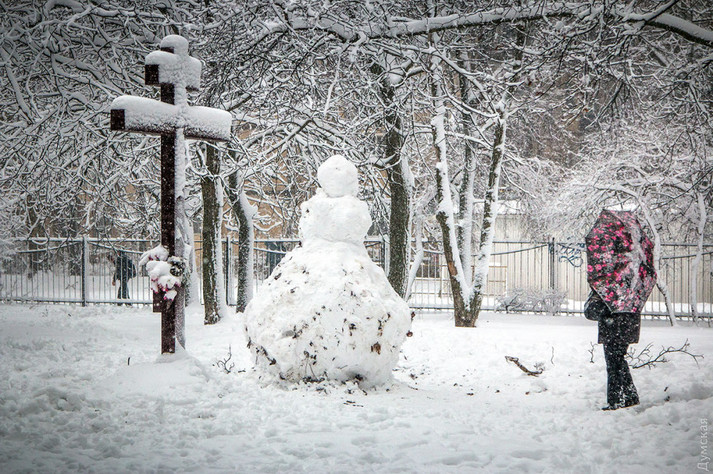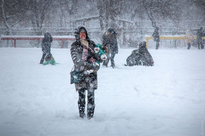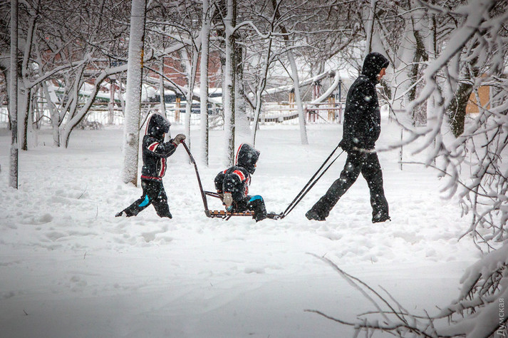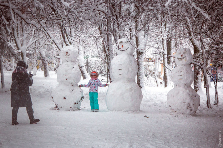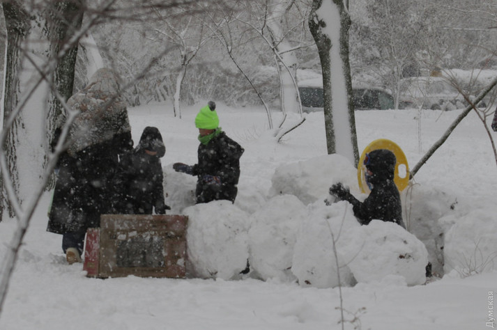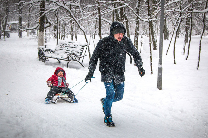 Незважаючи на робочий день, багато одеситів цілими сім'ями вирушили в парки, щоб пограти в сніжки, покататися на санках або зліпити сніговика.