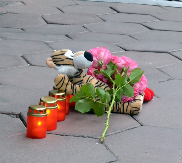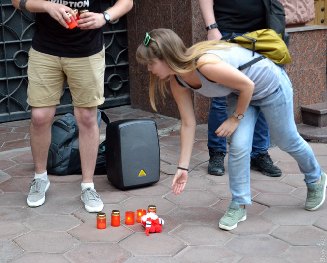 Учасники акції принесли з собою лампадки та іграшки, які поклали біля входу в будівлю на Єврейській, 12.