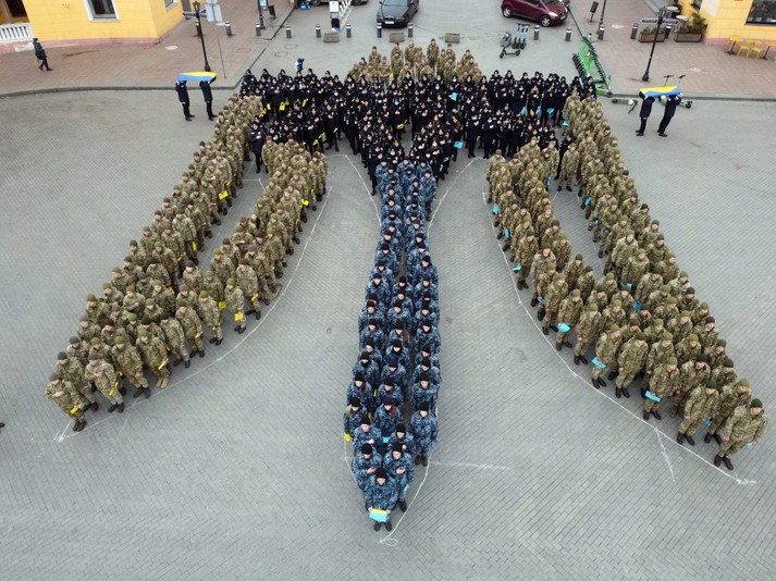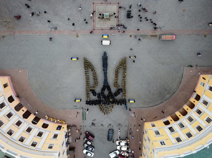 На площі біля Дюка на Приморському бульварі одеські курсанти провели флешмоб. Учасники перформансу вишикувалися у фігуру національного символу. Про це повідомляє «Армія.Inform».