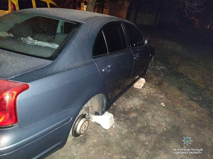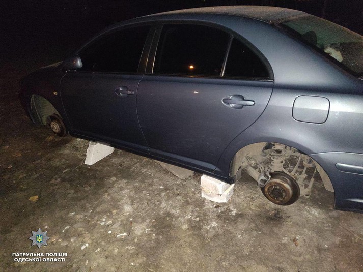 У неділю вранці патрульним надійшов виклик про підозрілих осіб, які нишпорять біля припаркованої автівки в одному з дворів на вулиці Іцхака Рабіна в Одесі. На місці інспектори виявили автомобіль Toyota Avensis, який стояв без номерних знаків та коліс. Про це інформує патрульна поліція Одеської області.