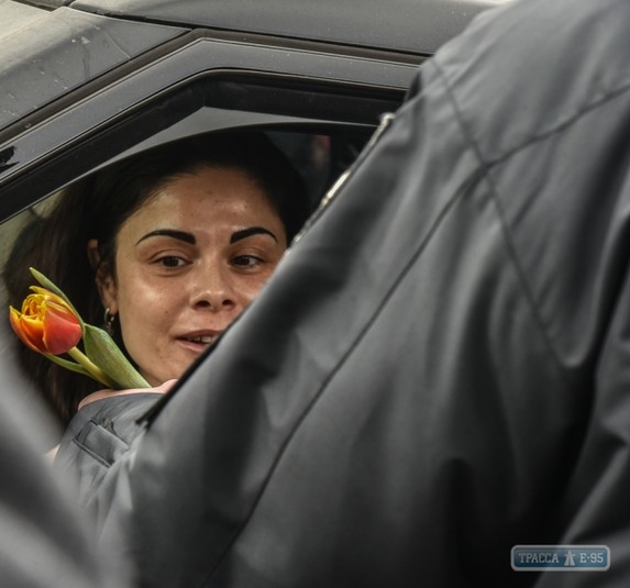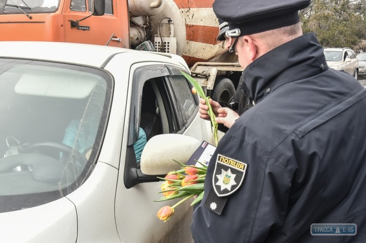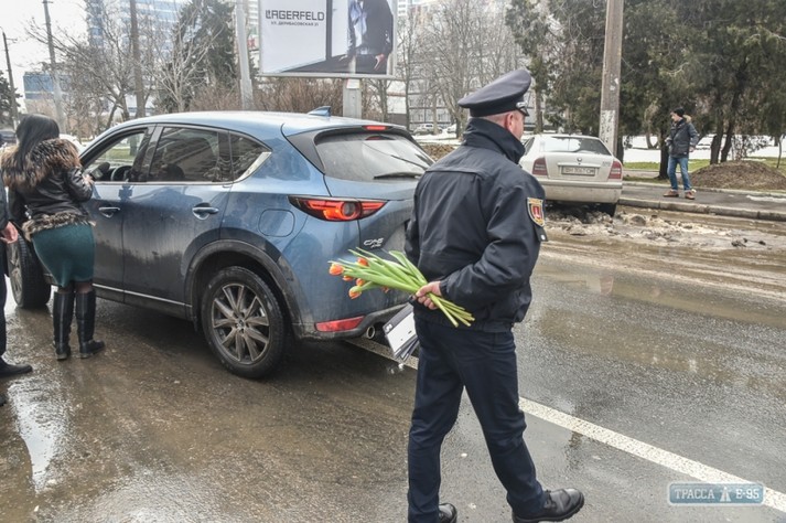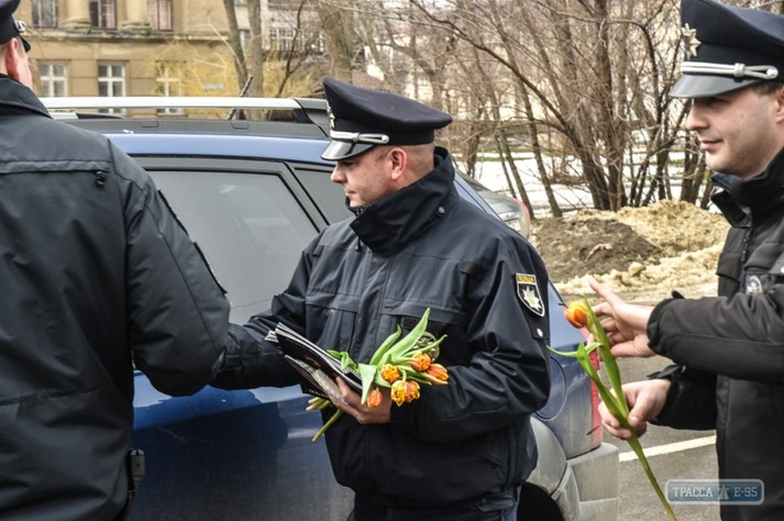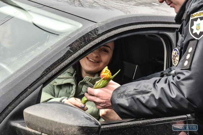 Патрульні поліцейські зупиняли одеситок, яки були за кермом власних автомобілів, і дарували їм тюльпани.