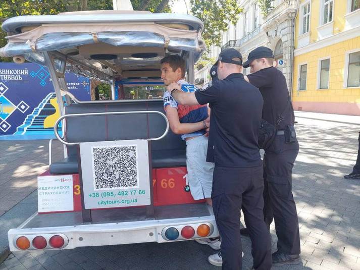 Правоохоронці повідомили, що в понеділок, 23 серпня під час розгортання прапора України на Потьомкінських сходах чоловік поводився зухвало і провокував конфлікт з громадянами, що приєдналися до заходу.