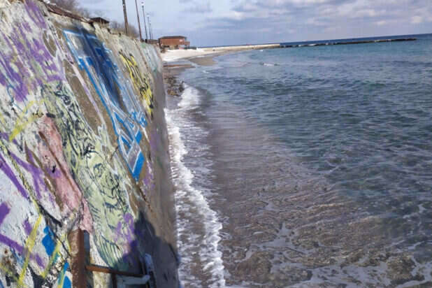 Хвилі змили більшу частину піску, залишилося лише кілька клаптиків суші біля двох рятувальних станцій. Сходи ж тепер спускаються прямо в море.