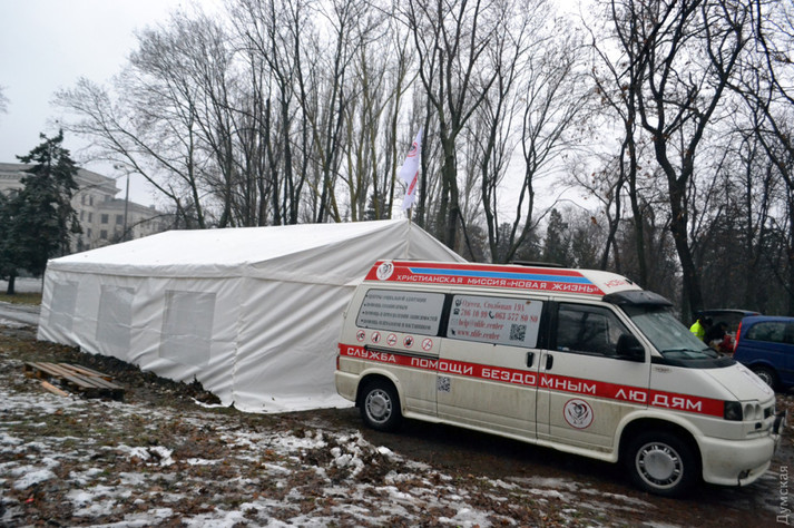 На Куликовому полі в Одесі почав працювати пункт обігріву для бездомних. Намет, в якому всі нужденні можуть зігрітися та отримати гаряче харчування, розгорнула Міжнародна християнська місія «Нове життя».