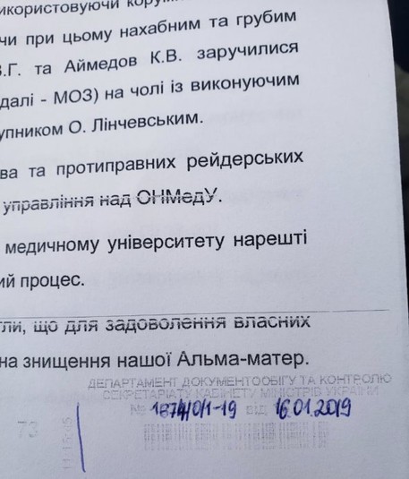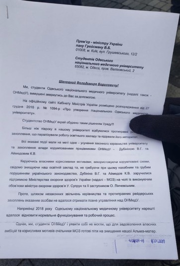 Студенти звернулися до прем'єр-міністра з вимогою зберегти статус вишу і звільнити керівників МОЗ. В іншому випадку акція протесту стане безстроковою. КМУ прийняв і завізував звернення.Нагадаємо, ініціативі МОЗ передувало кілька спроб змінити керівництво ОНМедУ. Згідно із законом про вищу освіту, ректори вузів обираються вченою радою, а не призначаються керівним органом. Попри це, МОЗ призначило в.о. ректора університету Владлену Дубініну.