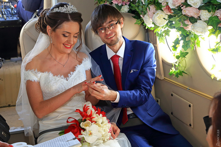 «Спочатку я була шокована пропозицією вирушити на аеродром, щоб розписати молодят. Звичайно, зараз ми працюємо в самих різних місцях і закладах, запити бувають різні, до цього випадку я можу пригадати лише укладення шлюбу в повітряній кулі, але шлюб в літаку - такого не було ніколи », - розповідає Анна Колесник.