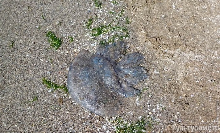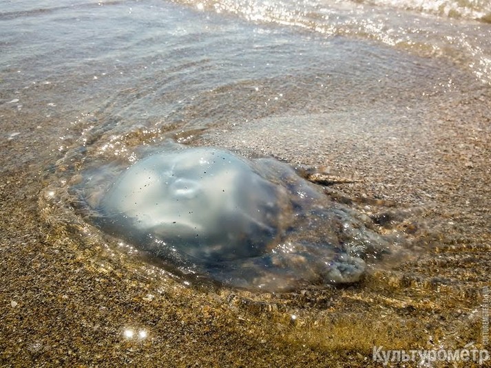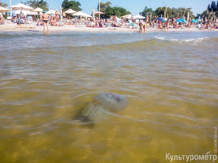 На пляжі в Лузанівці спостерігається нашестя великих медуз корнерот. Ці граційні істоти зазвичай плавають на глибині і вважають за краще холодну воду, але щось змусило сотні медуз підпливти близько до берега.