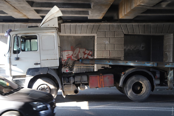 В Одесі водій вантажівки намагався проскочити під мостом, але не врахував висоту (фото)